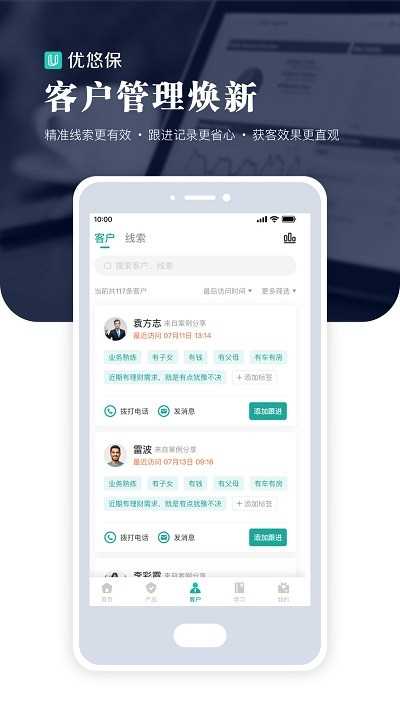2.更专业的CRM体验:引导并促进顾问对其客户进行卓效的客户关系管理,通过系统自动化地为保险顾问管理好其重要的客户数据与签单数据。