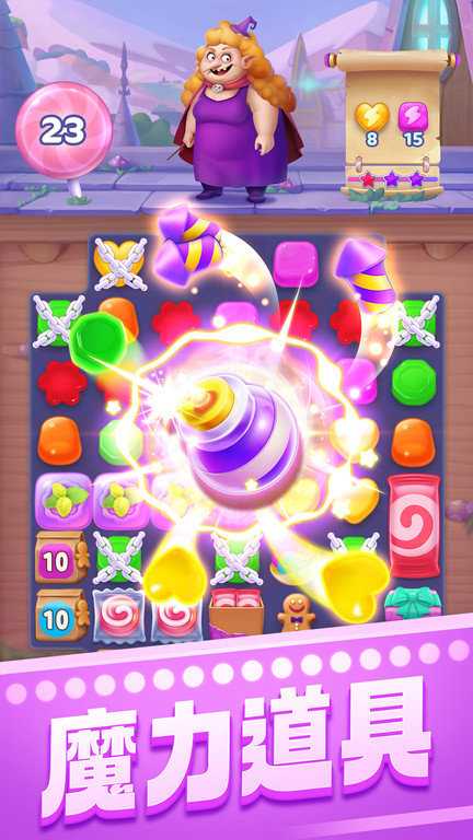 《宾果消消消》在消除玩法上抛弃传统的指尖滑来滑去的单纯玩法,融入了许多策略元素和军旗的规则,如果你只是考虑当前步奏,可能在规定的步奏之内,是很难消除够规定的糖果数。而当你划一步能顾及到后面一步或几步的话,就很有可能出现连消或大面积消除的激情场面,完成目标通过关卡,是很轻松的;再比如有巫婆的关卡,巫婆会根据你走的步奏优劣触发她释放诅咒,诅咒会将糖果给冰封,给你消除带来麻烦和障碍,让你举步维艰,所以在消除的时候,一定要做到尽量阻止巫婆释放诅咒。
