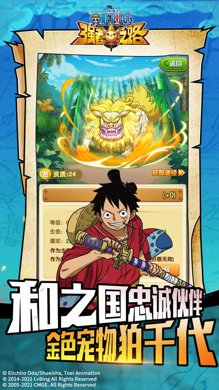 ONE PIECE动画正版授权手游《航海王强者之路》周年庆典火爆开启,强者同庆,惊喜不停!全新版本引爆顶上战争,一起营救火拳艾斯!天生红卡,新任海军元帅赤犬重磅登场!异步竞技,跨服争夺海盗王者!强者对决,激战王下七武海!航海王动画经典还原,热血战斗等你加入!