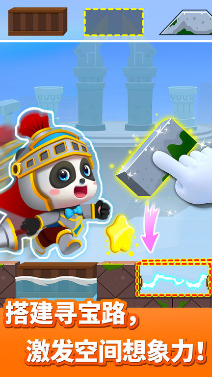 前方道路太高,几何块不够用怎么办?别忘了有特殊装置:放上弹簧,一跃而上。咻,安全到达高处。如何运用道具,考验着宝宝的全局规划哦。