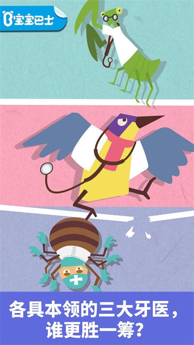 宝宝巴士儿童早教应用宝宝小牙医医院开张咯~三个身怀绝技的小动物,用你意想不到的方式来保护牙齿!拔牙、治疗龋齿、牙齿清洁……各种牙齿问题,在这里都能顺利得到解决~这个医院里,没有吓人的大钳子、针筒和听诊器,只有有趣益智儿童早教游戏!宝宝巴士,给宝宝一个快乐童年!
