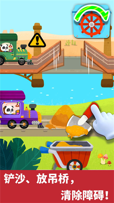 2、攻破路上7大关卡,小火车遇到困难了,宝宝快发挥聪明才智,放下闸栏、清理铁路、修好铁轨,让火车行驶顺畅;