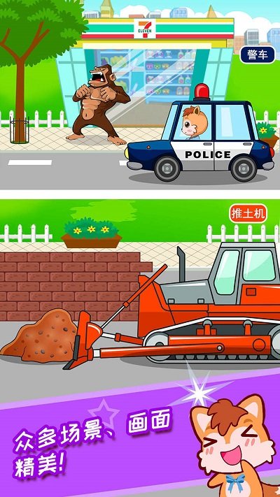 海量场景:警车、救护车、挖掘机等...20种交通工具,应有尽有;