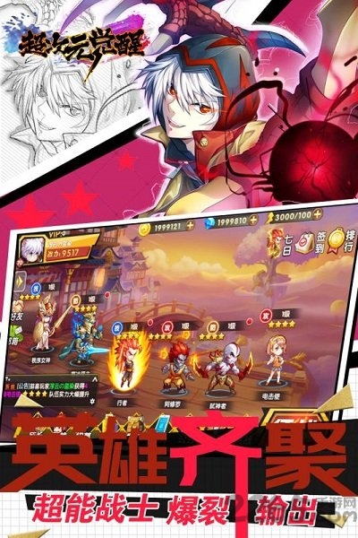 《超次元觉醒》是款二次元英雄大乱斗的对战手游,大家将在游戏中开启卡牌乱斗,你可以收集各类二次元作品中的英雄角色进行战斗,还可以提升英雄的卡牌等级、星级,全面提升角色实力,通过阵容搭配挑战闯关。