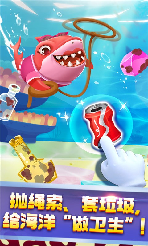 小北极熊的家园里,漂浮着好多垃圾。清理垃圾就交给鲨鱼宝宝吧:捡起冰上垃圾、清理洋面垃圾……垃圾清扫完成。