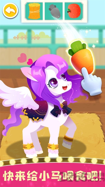 备赛的小马都吃什么呢?小麦饼干、青草蛋糕,远远不够哦。再去选购一些蔬菜水果吧:玉米、胡萝卜、苹果……营养丰富的食物搭配,才能让小马更强壮!