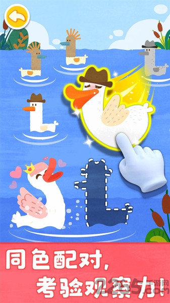 宝宝会给玩具分类吗?按照颜色类别,将相同颜色玩具归为一类;你能帮小白鹅找伙伴吗?仔细观察,跟小白鹅颜色一样的,才是它的伙伴哦~宝宝在益智互动中,分辨不同颜色,从而加深颜色认知。