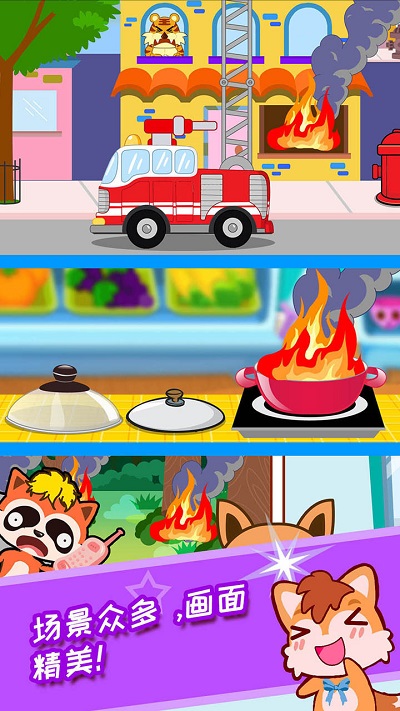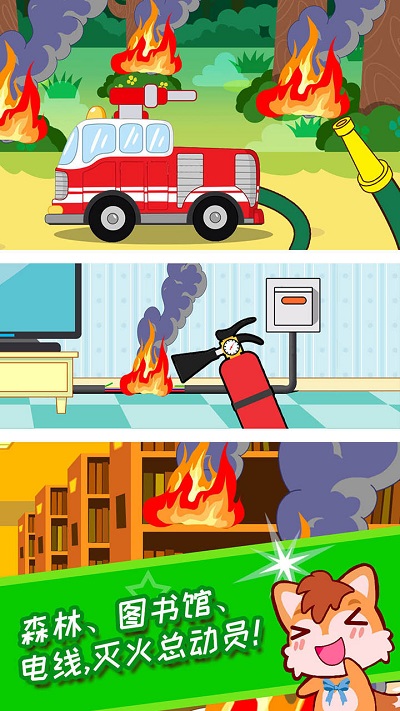 儿童消防小分队游戏是一款早教游戏,这款游戏中宝宝扮演的角色是一名消防员,在面临不同情况的起火时不同的做法,让孩子在潜移默化中学会了消防小知识,在危险中如何保护好自己,感兴趣的朋友快来下载吧!儿童消防小分队安卓版玩法家里电线着火,先关掉电源总闸,再