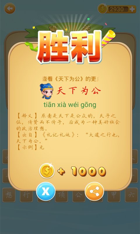 ◆每个成语关卡都有对应的解释与出处。寓教于乐,独一无二的中文猜谜游戏!