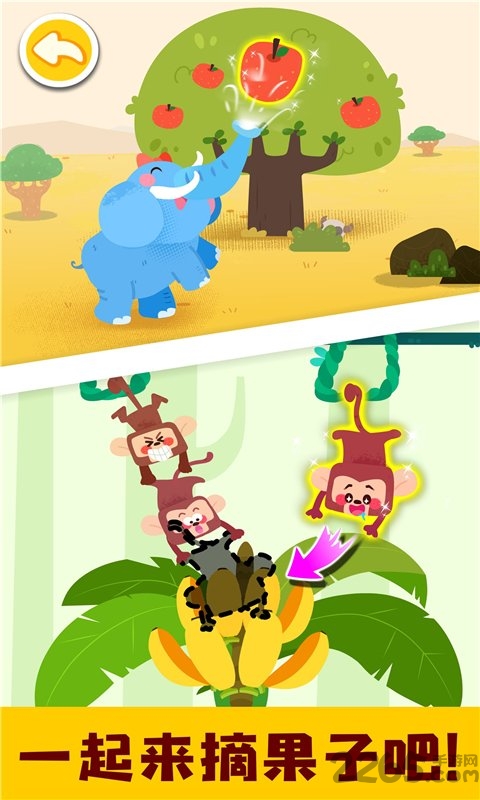 到了小动物们的用餐时间啦。看,猴子们正在滑绳索,过山崖,摘香蕉!小猫为了抓鱼不小心掉进水里啦,2265宝宝来帮帮它吧。长颈鹿宝宝饿了,摘下树叶喂给它。