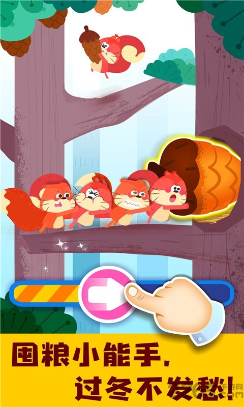 小松鼠的松果多到塞不进树洞了,帮它推一推吧。囤粮是每一个小松鼠的必修课哦。勤劳的小青蛙正忙着消灭害虫。哎呀,小青蛙挂在树枝上,下不来了。宝宝们,快来帮忙救下它吧。