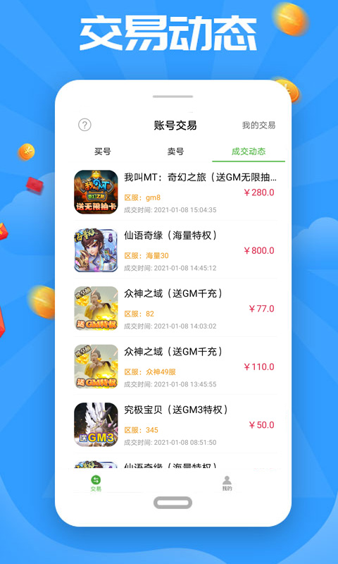 1、交易升级系统:免手续费,账号自由交易,小号高价回收