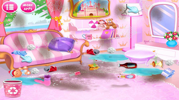 1.您可以通过不同的活动来清理这间公主房间或城堡或房屋,如拉直灯,壁挂,灯具,家具,重新安排她的玩偶,软玩具和其他物品,擦洗污渍,扫地和拖地,擦拭墙壁污渍,用抹布去除蜘蛛网,用新鲜水果碗和餐具安排餐桌,2.吸尘地板,丢弃垃圾等等!在公主大厦翻新和装饰房间!通过清洁和装饰来照顾这个梦想家园。
