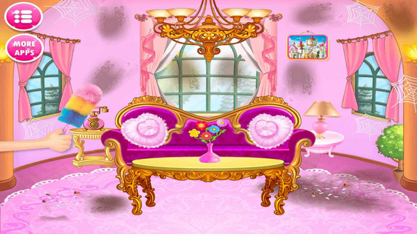 3.客厅清洁:客厅/大厅也很杂乱!让我们帮助这个可爱的公主清理大厅,拆除蜘蛛网,拖地板,给墙壁和家具上灰尘,固定花盆,加上鲜花,重新安装灯具,枕头等,固定吊灯。